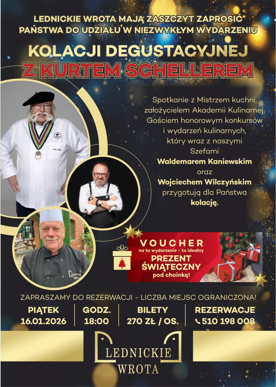Rezerwacje można zakładać telefonicznie pod numerem tel. 510 198 008, mailowo: biuro@lednickiewrota.pl lub osobiście w Restauracji.